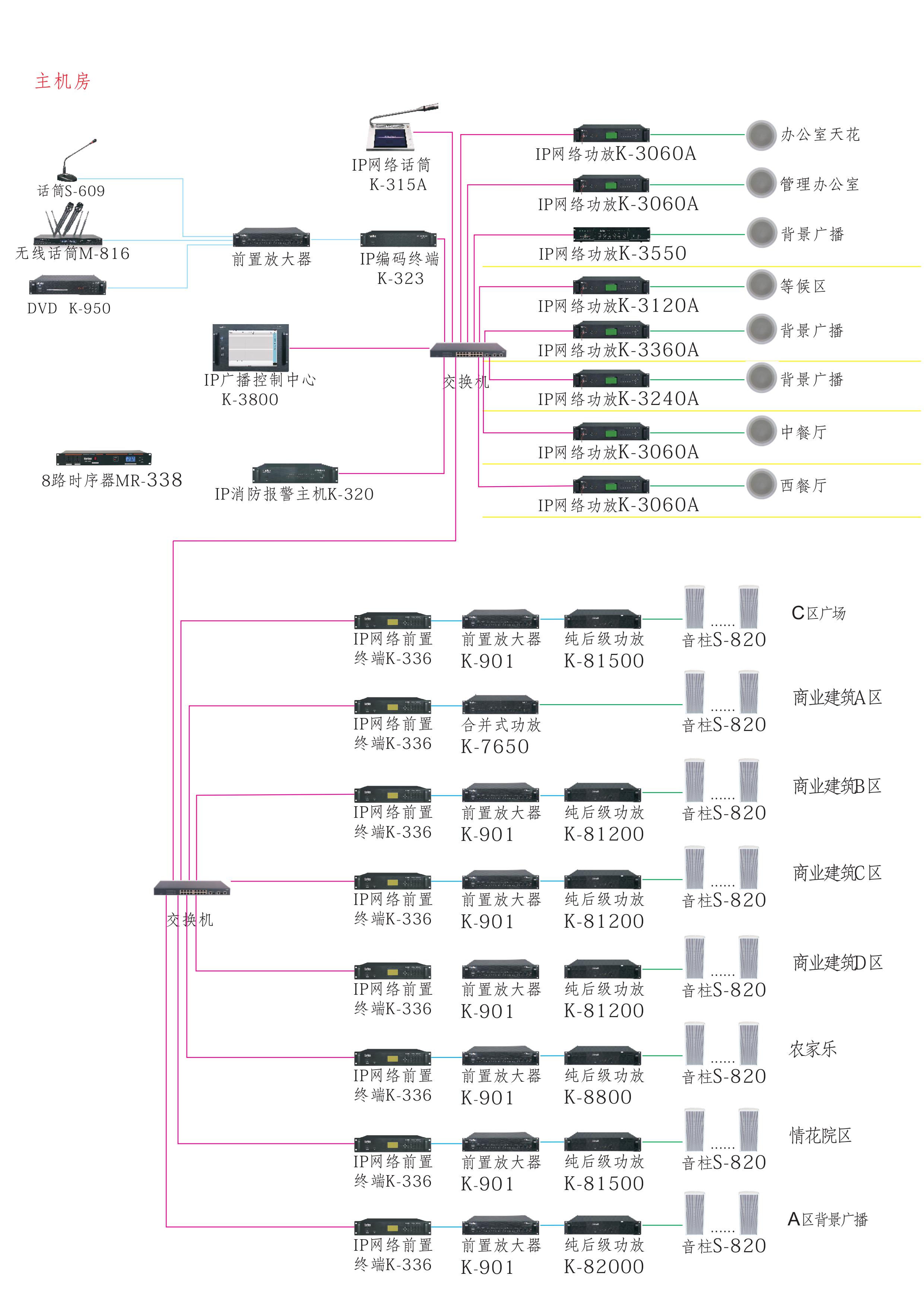 1.大型商業(yè)綜合體廣播系統(tǒng)共用計(jì)算機(jī)網(wǎng)絡(luò)或布設(shè)廣播專用網(wǎng)絡(luò),音源輸入使用8分區(qū)的IP網(wǎng)絡(luò)輸入單元,可提供多達(dá)8路高質(zhì)量音樂(lè)廣播音源,用于酒店、大型商場(chǎng)、寫(xiě)字樓、停車場(chǎng)的信息發(fā)布及背景音樂(lè)播放,也可為寫(xiě)字樓提供上下班定時(shí)打鈴功能;