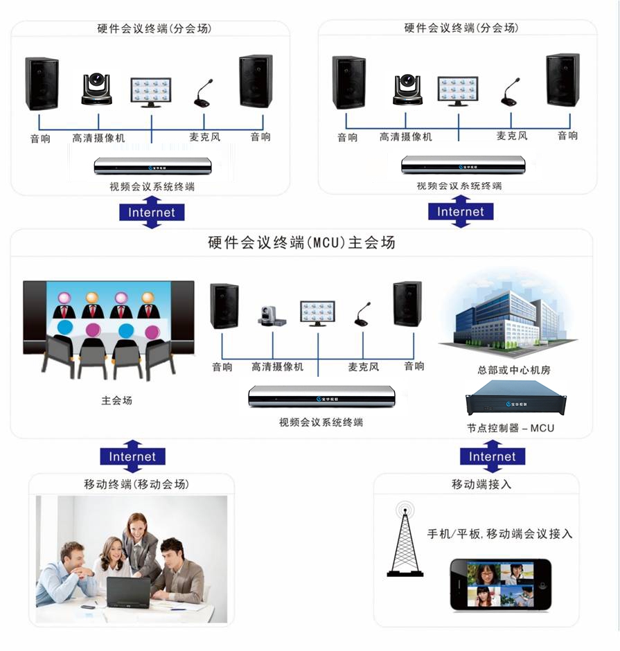 遠(yuǎn)程視頻會(huì)議系統(tǒng)是指兩個(gè)或兩個(gè)以上不同地方的個(gè)人或群體,通過(guò)傳輸線路及多媒體設(shè)備,將聲音、影像及文件資料互相傳送,達(dá)到即時(shí)且互動(dòng)的溝通,完成會(huì)議目的系統(tǒng)。與傳統(tǒng)電話會(huì)議相比,具有直觀性強(qiáng),信息量大等特點(diǎn)。視頻會(huì)議系統(tǒng)不僅可以聽到聲音,還可以看到會(huì)議參加者,共同面對(duì)商討問(wèn)題,研究圖紙、實(shí)物,與真實(shí)的會(huì)議無(wú)異,使每一個(gè)與會(huì)者確有身臨其境之感