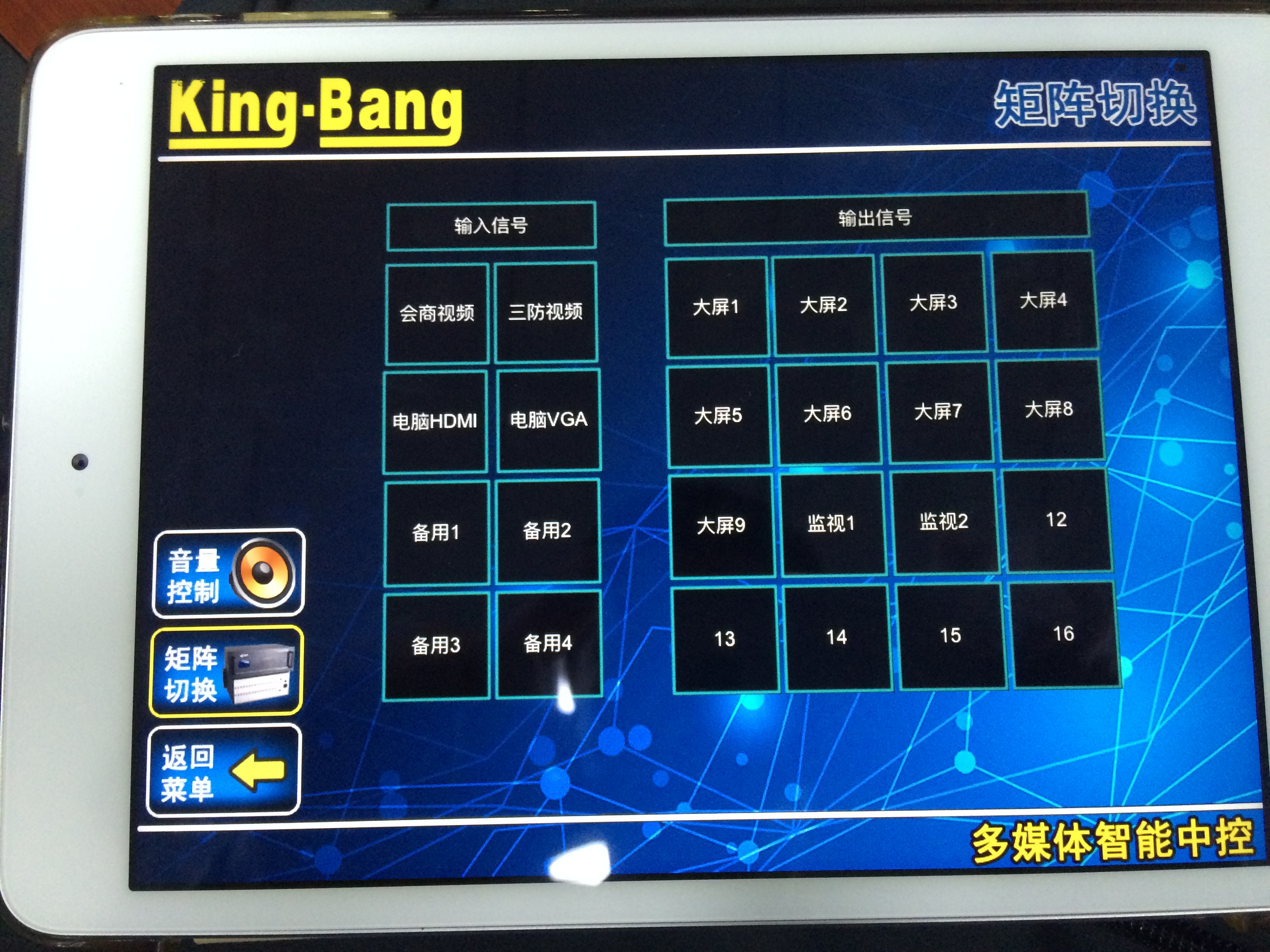 京邦電子(KING-BANG)以用戶為中心,根據(jù)茂名市化州氣象局會(huì)議室現(xiàn)場(chǎng)情況,并結(jié)合客戶需求,提出了一套完美的智能會(huì)議中控解決方案。京邦電子(KING-BANG)提供解決方案是采用的是可編程中央控制主機(jī)K-4960作為會(huì)議室控制系統(tǒng)的核心運(yùn)算主機(jī),對(duì)會(huì)議室的聲、光、電設(shè)備的操控進(jìn)行整合,然后經(jīng)過(guò)程序編寫(xiě)將所有的控制集中到觸摸屏控制界面,搭配京邦電子(KING-BANG)其他中控周邊設(shè)備,完美實(shí)現(xiàn)一鍵智能化控制。